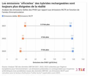 Cette dernière a analysé les émissions réelles de ces véhicules, constatées grâce à des dispositifs embarqués sur 127 000 hybrides rechargeables immatriculées en 2023. Elle les a comparées aux résultats des tests d’homologation officiels (dits norme WLTP). « L’analyse des données de l’Agence européenne pour l’environnement […] montre que les véhicules hybrides rechargeables immatriculés en 2023 émettent en moyenne 139 g de CO₂ par kilomètre. En comparaison, les tests officiels WLTP parviennent à des émissions de 28 g de CO₂ par kilomètre », constate-t-elle.