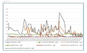 Pour les composés organiques on trouve quelques rares solvants organiques (mais les dosages ont été arrêtés en 2019) et des pesticides avec leurs métabolites.